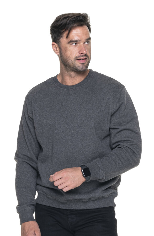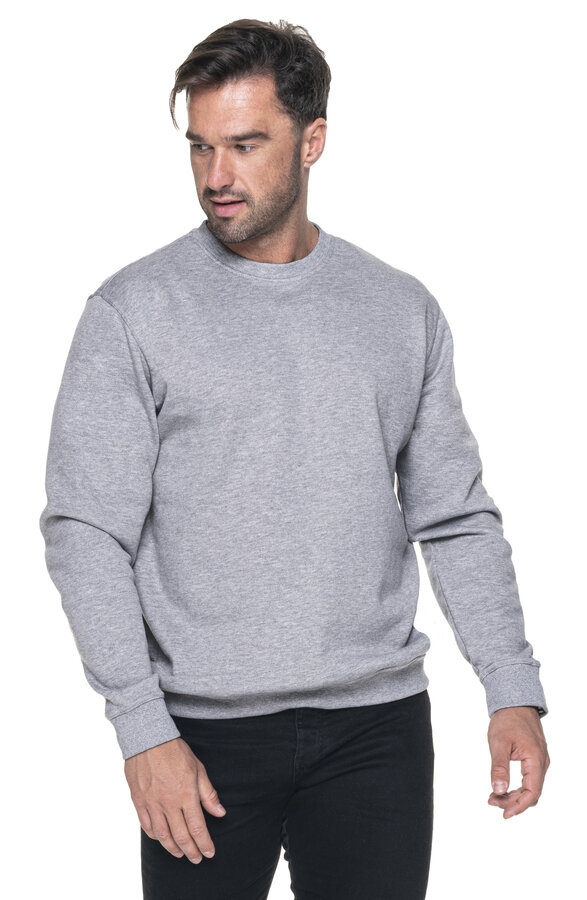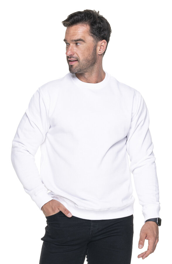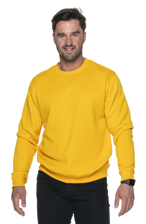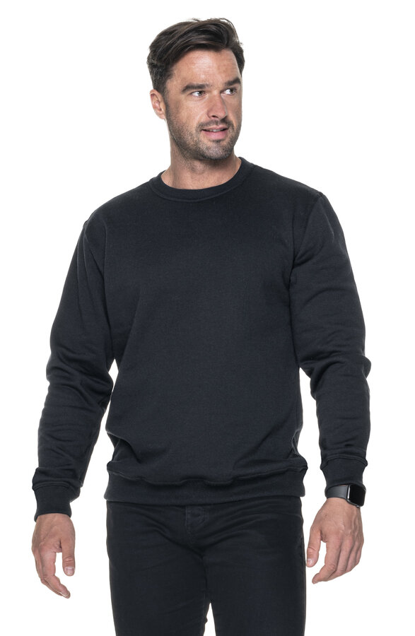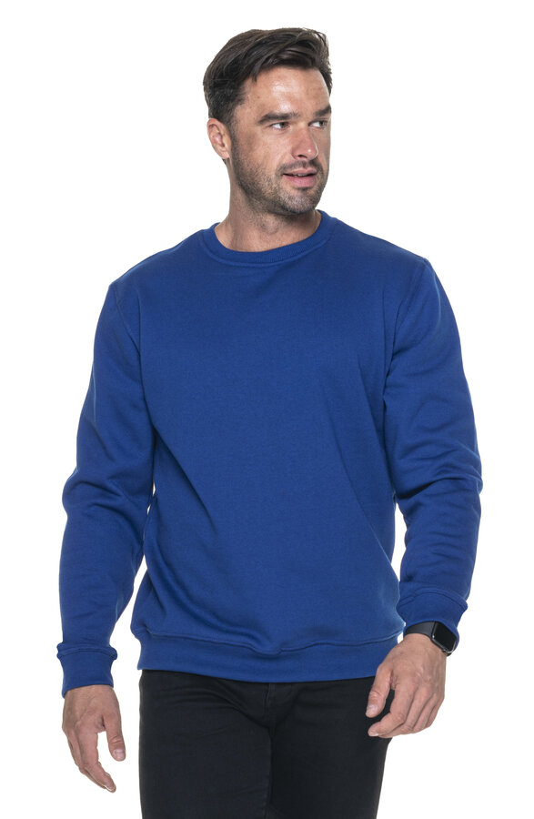 Prosta, klasyczna bluza męska wykonana z miękkiej dzianiny; gruby materiał od wewnątrz szczotkowany; dekolt, rękawy oraz dół błuzy wykończone dwuwarstwowym ściągaczem z elastanem rib 2x2, zapewniającym dłuższą trwałość; kark i ramiona z taśmą wzmacniającą i stabilizującą, która pozytywnie wpływa na trwałość szwów; podwójne, gęste szwy do których wykorzystano nici najwyższej jakości.