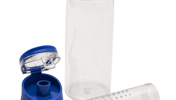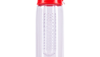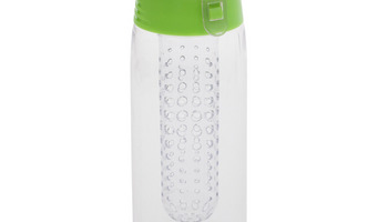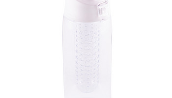 Lekki, szczelny bidon z solidnym zamknięciem, wyposażony w pojemnik na kawałki owoców lub miętę. Wykonany z tritanu - wytrzymałego, przezroczystego tworzywa niezmieniającego smaku napoju. Wolny od BPA.