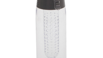 Lekki, szczelny bidon z solidnym zamknięciem, wyposażony w pojemnik na kawałki owoców lub miętę. Wykonany z tritanu - wytrzymałego, przezroczystego tworzywa niezmieniającego smaku napoju. Wolny od BPA.