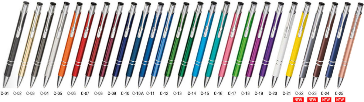 Polecamy Państwu długopisy metalowe Cosmo. Są one jednymi z częściej wybieranych przez klientów. Długopisy metalowe z tej serii można ujrzeć zarówno w korporacjach, niewielkich firmach, jak i instytucjach państwowych. Są niezwykle funkcjonalne i wygodne. Dostępna jest bogata kolorystyka – aż 25 barw, wśród których z pewnością znajdzie się ta, jaka pasować będzie do wizerunku Państwa firmy bądź kampanii promocyjnej.