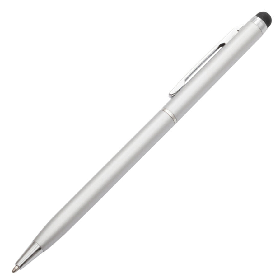 Długopis z końcówką przystosowaną do ekranów dotykowych. Korpus wykonany z aluminium, skuwka z metalu. Wkład w kolorze niebieskim. Posiada obrotowy mechanizm włączania.