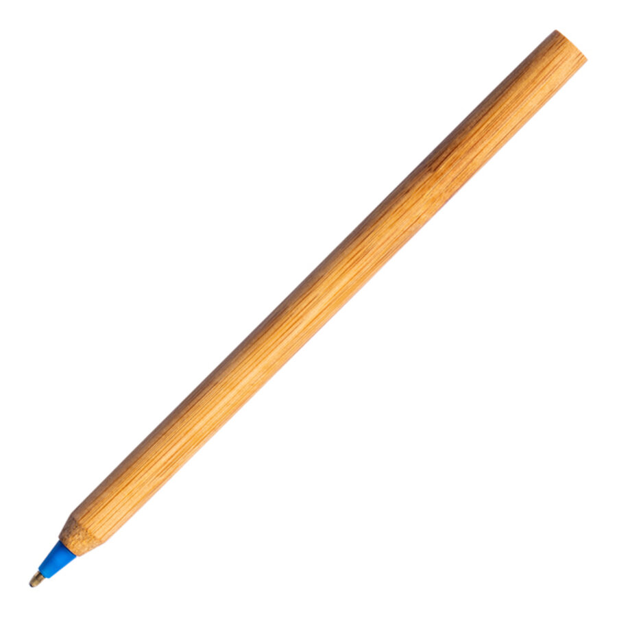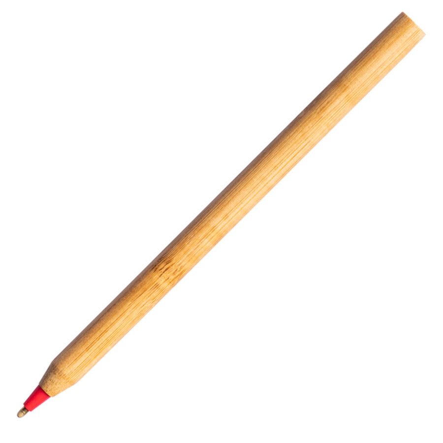 Bambusowy długopis z kolorową końcówką. Długopis nie posiada zatyczki. Końcówka wkładu zabezpieczona za pomocą wosku.