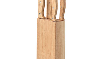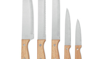 Zestaw noży drewnianych zawierający 5 noży: nóż szefa kuchni, nóż do chleba, do plastrowania, obieraczka i uniwersalny nóż kuchenny. Wszystkie noże idealnie pasują do drewnianej podstawy. Drewniany akcent nadaje temu zestawowi ładny, naturalny i stylowy wygląd w Twojej kuchni. Kompletny zestaw do krojenia warzyw, mięsa, ryb i chleba, aby przyrządzić najsmaczniejsze domowe potrawy. Noże są wykonane ze stali nierdzewnej i mają drewnianą rękojeść. Drewno jest produktem naturalnym, mogą występować niewielkie różnice w kolorze i rozmiarze poszczególnych elementów, co może mieć wpływ na końcowy efekt dekoracji.