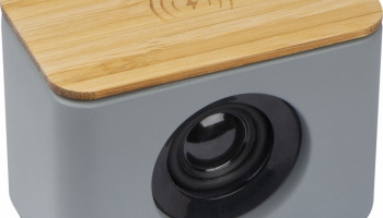 Głośnik Bluetooth z cementu wapiennego. W bambusowej części znajduje się zintegrowana ładowarka indukcyjna.