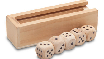Zestaw 5 kości do gry. Pakowany w drewniane pudełko.