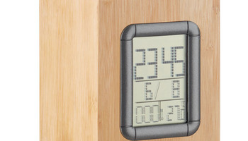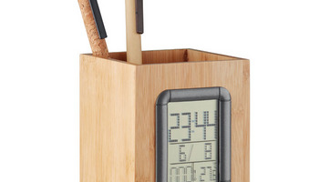 Bambusowy pojemnik na długopisy z cyfrowym kalendarzem, budzikiem i termometrem. Ten naturalnie wyglądający pojemnik na długopisy będzie świetnie wyglądał na każdym biurku w domu lub w biurze. Utrzymuj swoje miejsce pracy w ładzie i przechowuj w nim wszystkie długopisy, ołówki i inne artykuły biurowe. Wyświetlane informacje pozwolą Ci być na bieżąco z aktualnym czasem, datą i temperaturą w pomieszczeniu. W zestawie znajdują się 2 baterie. Bambus jest produktem naturalnym, mogą występować niewielkie różnice w kolorze i rozmiarze poszczególnych elementów, co może mieć wpływ na końcowy efekt dekoracji.