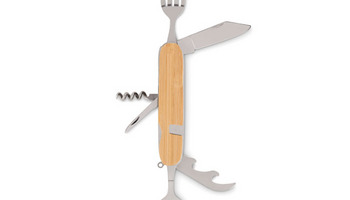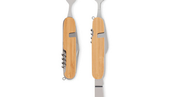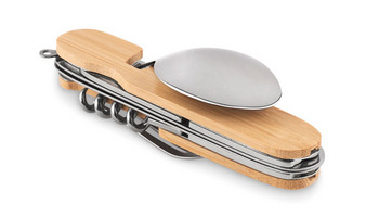 Metalowy wielofunkcyjny składany zestaw sztućców kempingowych wdrewnianej obudowie. Jedno narzędzie do wszystkiego, gdy spędzasz czasna świeżym powietrzu, wędrując lub biwakując. Wszystkie narzędzia mogąbyć złożone w drewnianej obudowie, gdy nie są używane. Posiada 5 funkcjii zawiera widelec, łyżkę, otwieracz do puszek, otwieracz do wina i nóż.Drewno jest produktem naturalnym, mogą występować niewielkie różnice wkolorze i rozmiarze poszczególnych elementów, co może mieć wpływ nakońcowy efekt dekoracji.