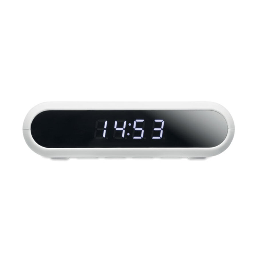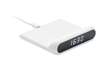 Ładowarka bezprzewodowa 10W z budzikiem z białymi diodami LED, w obudowie z tworzywa ABS. Zawiera kabel USB do ładowania typu C. Wyjście: DC 9V/1,10A (10W) do szybkiego ładowania. Kompatybilna z najnowszymi telefonami Android, iPhone® 8, X i nowszymi. Ten niewielki budzik z wyświetlaczem LED doskonale nadaje się do sypialni. Gdy śpisz, Twój telefon jest ładowany dzięki wbudowanej bezprzewodowej ładowarce o mocy 10 W.