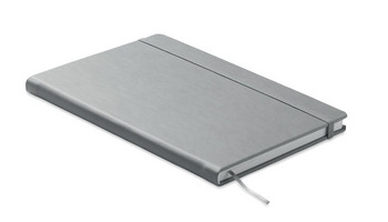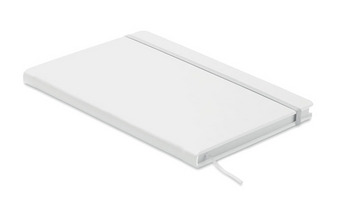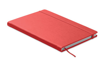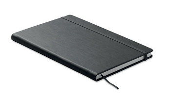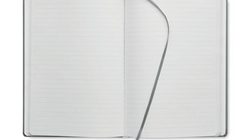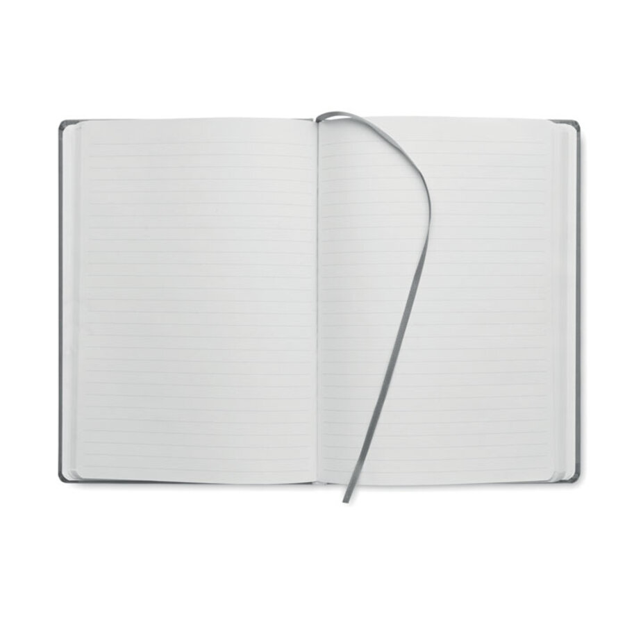 Notatnik A5 z twardą okładką z PU. 192 strony w linie (96 kartek) z papieru z recyklingu (80 g/m²). Dopasowana gumka zamykająca i tasiemka do zaznaczania stron. Wyprodukowano w UE.