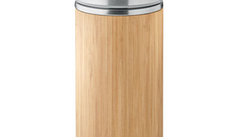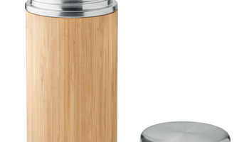Izolowany pojemnik na żywność z podwójną ścianką ze stali nierdzewnej z zakrętką. Wykończenie bambusowe. Pojemność: 600 ml.