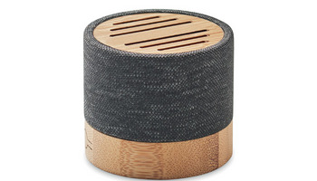 Głośnik bezprzewodowy 5.0 z RPET z bambusowym elementem. Sygnalizacja LED. 1 Akumulator Li-ION 400 mAh. Zawiera port kart SD oraz kabel AUX/USB. Wyjście: 3W, 3 Ohm i 5V. Czas odtwarzania ok. 3h.