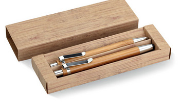 Bambusowy zestaw piśmienniczy w papierowym kartoniku. Zestaw zawiera przyciskany długopis z niebieskim wkładem oraz automatyczny ołówek.