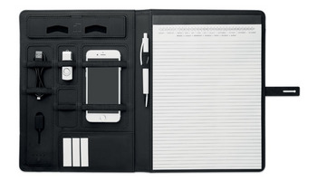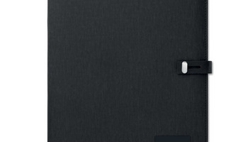 Teczka A4 z wykończeniem lniano-PU, z zamknięciem, zamykana na zatrzask. Ładowanie bezprzewodowe DC5V/1A. Power bank o pojemności 4000 mAh z łączem micro USB na złącze typu C. Notes z 20 kartkami w linie. Zawiera uchwyt na karty oraz uchwyt na długopis. Czarna aluminiowa płytka idealna do umieszczenia logo.