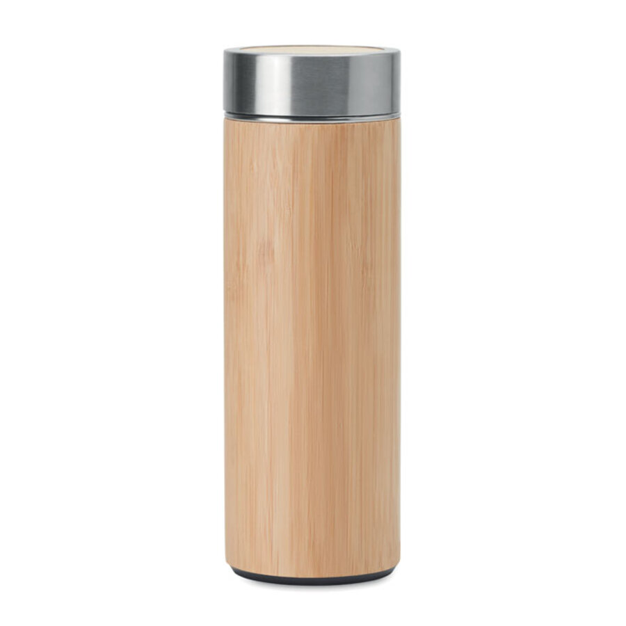 Termos z podwójnymi ściankami, stal nierdzewna z bambusową obudową, 400 ml, z dodatkowym zaparzaczem do herbaty. Ponieważ bambus jest materiałem naturalnym, kolory poszczególnych produktów mogą się różnić. Bambus jest produktem naturalnym, dlatego mogą wystąpić nieznaczne różnice w kolorze, wzorze i rozmiarze.