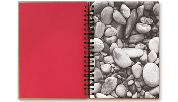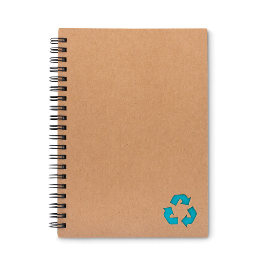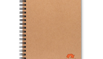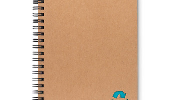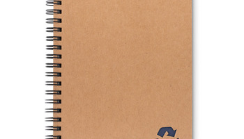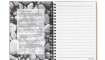 Okładka z kartonu pochodzącego z recyklingu. Podwójna spirala. 140 stron w linie z papieru kamiennego (70 kartek). Papier kamienny jest wykonany z wapienia (węglanu wapnia) i HDPE (żywicy polietylenowej) stosowanej jako spoiwo. Jest wodoodporny i odporny na działanie tłuszczów.