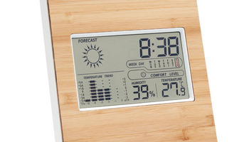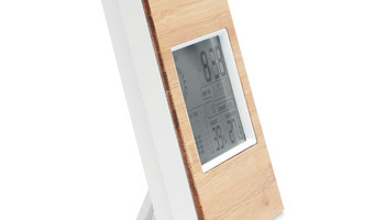 Bambusowy termometr wielofunkcyjny. Zawiera zegar, wyświetlacz temperatury, wilgotności i kalendarz. 2 baterie AAA nie wchodzą w skład zestawu.