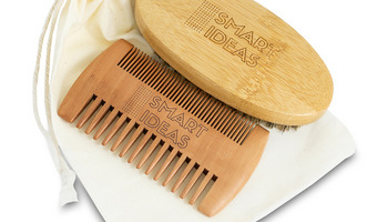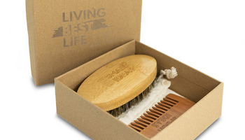3-częściowy zestaw do pielęgnacji: szczotka do brody, grzebień oraz bawełniany woreczek, zapakowane w tekturowe pudełko.