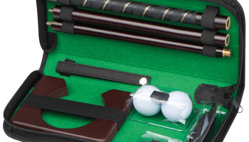 Mini zestaw do gry w golfa Mini zestaw do golfa: kij, dwie piłeczki i drewniany dołek w zamykanym na zamek etui z PU. Dodaj do zapytania