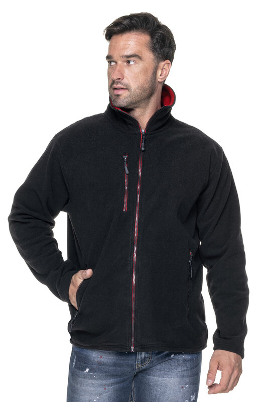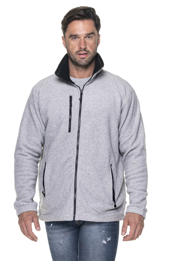 Męska ciepła bluza polarowa; wstawki w kontrastowym kolorze; zamek główny oraz kieszeni kostkowy, plastikowy; zamykana kieszeń na piersi; system ściągaczy u dołu wewnątrz; elastyczna taśma wszyta w mankietach; wykończenie antypillingowe materiału zapobiegające mechaceniu się.