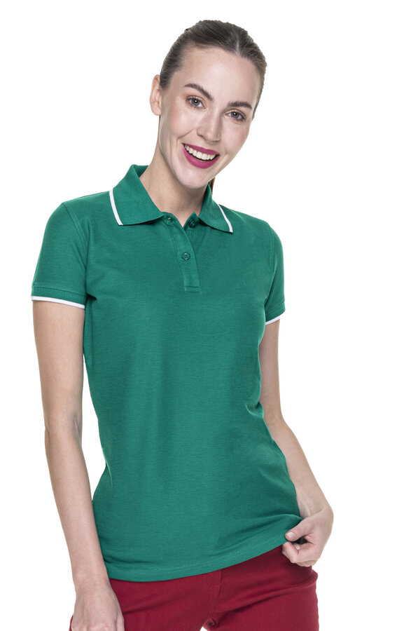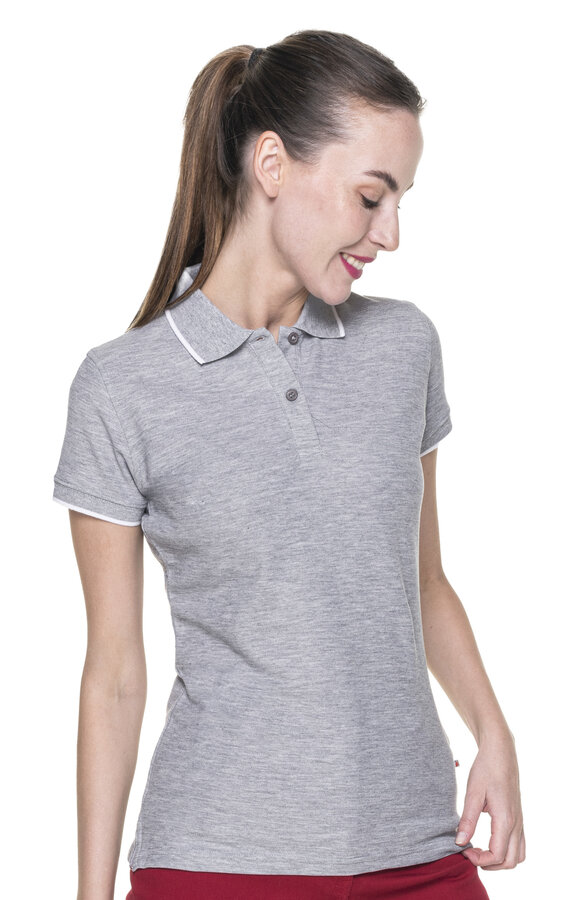 Damska koszulka polo z krótkim rękawem wykonana z dzianiny pique; taliowany fason; materiał poddany praniu enzymatycznemu, dzięki czemu jest miękki i pozbawiony nierówności; płaski kołnierz; kołnierz oraz rozcięcie na bokach wykończone kontrastową taśmą wzmacniającą od wewnątrz; ramiona z taśmą wzmacniającą i stabilizującą, która pozytywnie wpływa na trwałość szwów; zakończenia rękawów i kołnierz wykonane z ribu 1x1 z dekoracyjnym paskiem; dwa guziki; podwójne, gęste szwy do których wykorzystano nici najwyższej jakości.