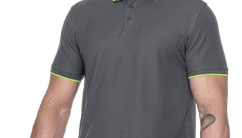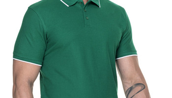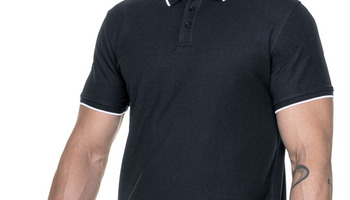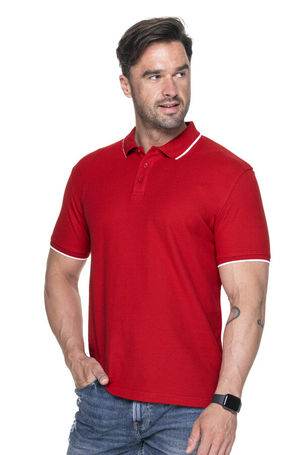 Męska koszulka polo z krótkim rękawem wykonana z dzianiny pique; lekko dopasowany fason; materiał poddany praniu enzymatycznemu, dzięki czemu jest miękki i pozbawiony nierówności; płaski kołnierz; kołnierz oraz rozcięcie na bokach wykończone kontrastową taśmą wzmacniającą od wewnątrz; ramiona z taśmą wzmacniającą i stabilizującą, która pozytywnie wpływa na trwałość szwów; zakończenia rękawów i kołnierz wykonane z ribu 1x1 z dekoracyjnym paskiem; trzy guziki; podwójne, gęste szwy do których wykorzystano nici najwyższej jakości.