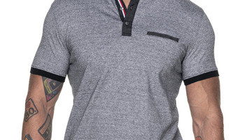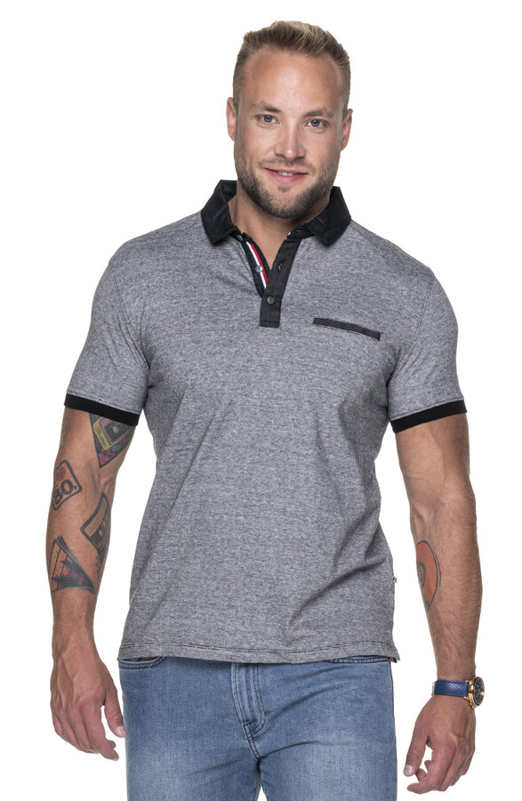 Męska koszulka polo z krótkim rękawem wykonana z dzianiny single jersey; dopasowany fason;prążkowany materiał; kołnierz ze stójką wykonany z cienkiego jeansu; kołnierz i rozcięcie na bokach wykończone kontrastową taśmą wzmacniającą od wewnątrz; ramiona z taśmą wzmacniającą i stabilizującą, która pozytywnie wpływa na trwałość szwów; rękawy zakończone ściągaczem rib 1x1; ozdobna imitacja kieszeni na piersi; listwa z trzema guzikami z kontrastową taśmą wzmacniającą; podwójne, gęste szwy do których wykorzystano nici najwyższej jakości.