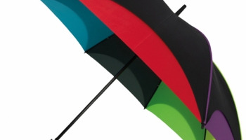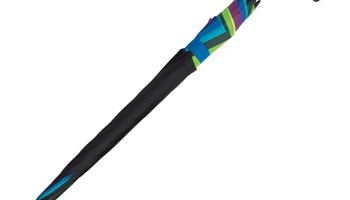Duży parasol automatyczny z plastikową rączką wykonany z poliestru. Parasol wyróżnia się nietypowymi, dwukolorowymi panelami.