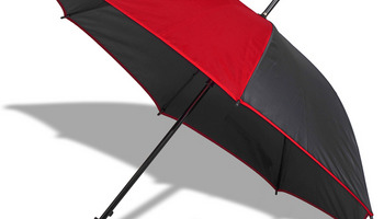 Czarny parasol z poliestru 190 T z kontrastującym czerwonym obszyciem i panelem. Wyposażony w ergonomiczną plastikową rączkę. Rama i żebra wykonane z metalu. Średnica 1060 mm.