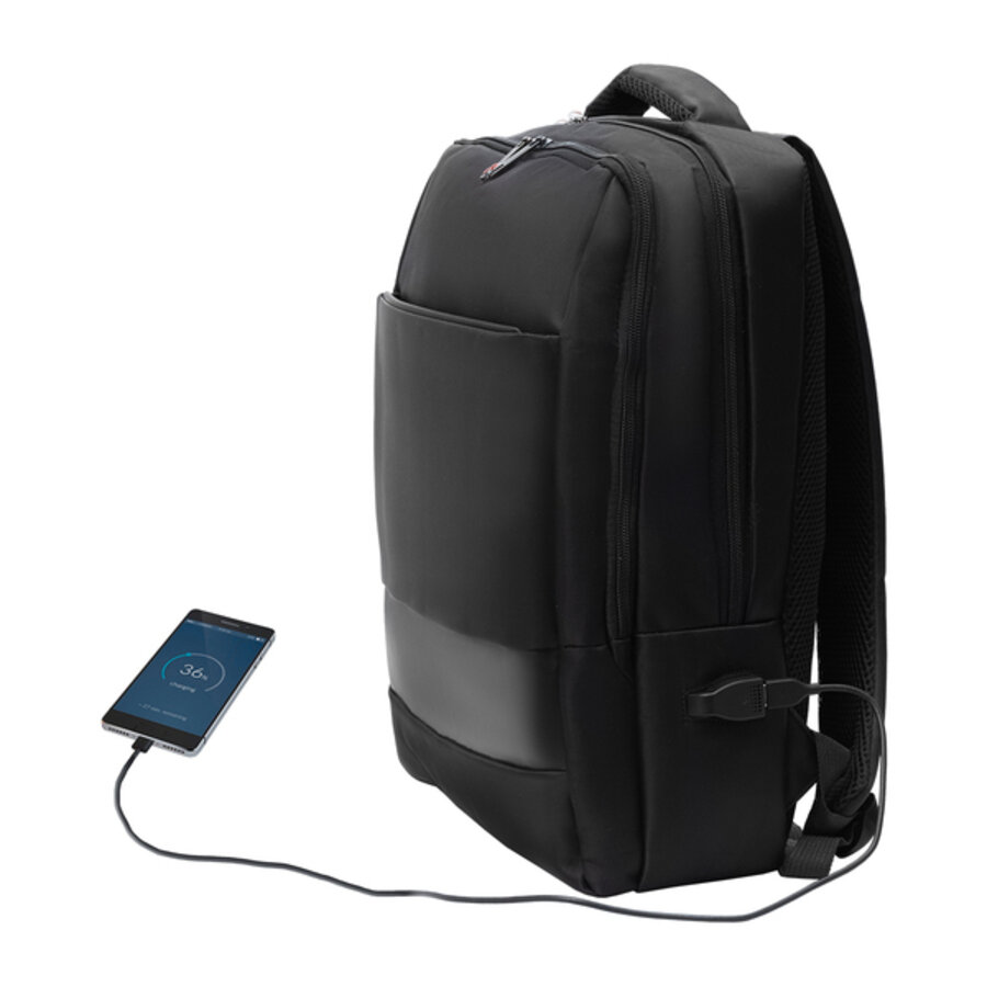Plecak wyposażony w 2 oddzielne, duże komory zamykane na zamek. W tylnej znajduje się kieszeń przeznaczona na laptop 17". Dodatkowo w drugiej komorze są 3 wewnętrzne kieszonki. Na zewnątrz spora kieszeń zamykana na zamek a z boku gniazdo USB, dzięki któremu można podpiąć swój smartfon do powerbanka. Kabel USB w zestawie. Wnętrze plecaka wykończone jest poliestrową podszewką. Miękkie wygodne plecy, szelki i uchwyt pokryte są siateczką. Pojemność około 19L