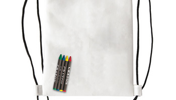 Plecak z materiału non woven w białym kolorze do samodzielnego kolorowania. Wyposażony w 4 kredki woskowe w kolorach: czerwony, niebieski, żółty i zielony.