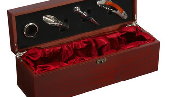 Wyściełana tkaniną, drewniana skrzynka na wino zawierająca wykonane z metalu i drewna akcesoria konesera trunków.