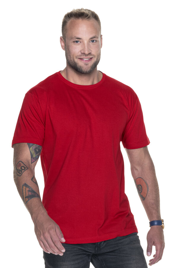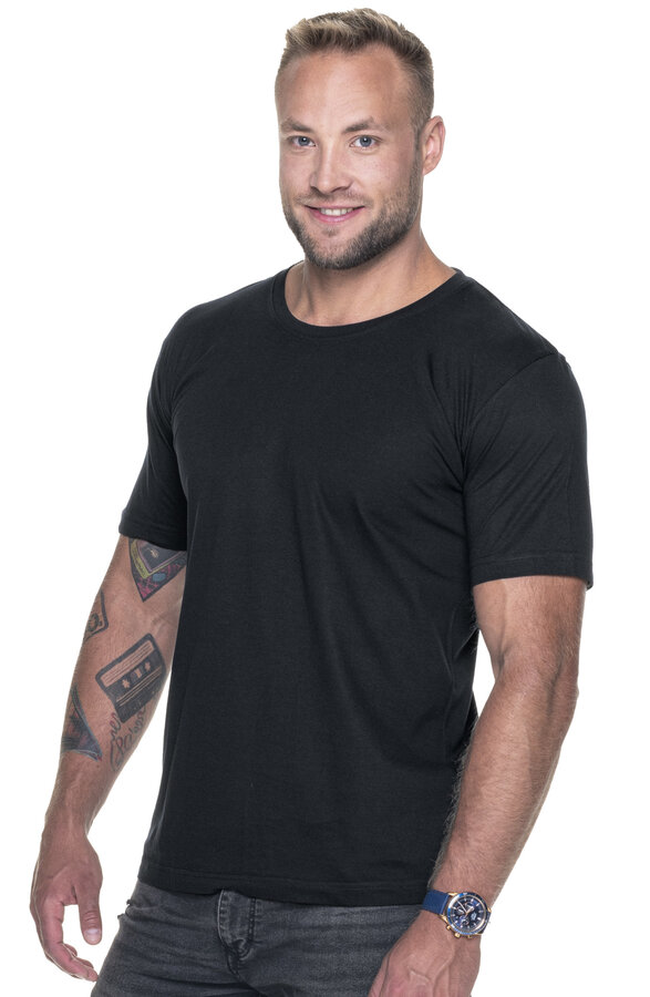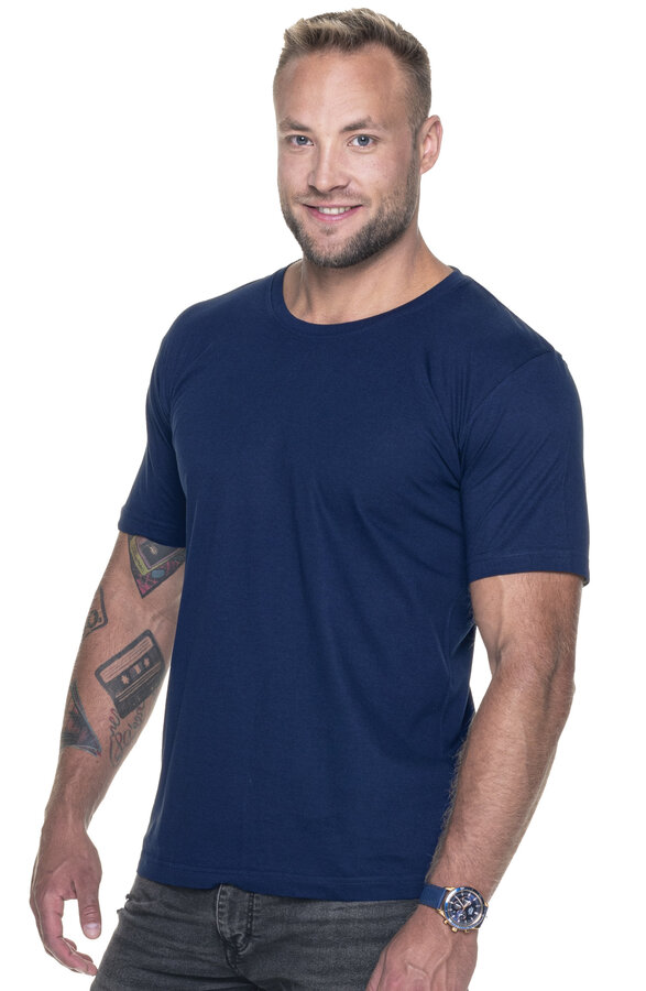 T-shirt męski z krótkim rękawem wykonany z dzianiny single jersey; klasyczny fason; materiał poddany praniu enzymatycznemu, dzięki czemu jest pozbawiony nierówności; wykończenie silikonowe materiału powodujące że jest miękki i miły w dotyku; dekolt wykończony dwuwarstwowym ściągaczem z elastanem zapewniającym dłuższą trwałość; kark i ramiona z taśmą wzmacniającą i stabilizującą, która pozytywnie wpływa na trwałość szwów; boki bezszwowe zapewniające lepszy komfort w noszeniu i dające większe możliwości nadruku; podwójne gęste szwy do których wykorzystano nici najwyższej jakości.