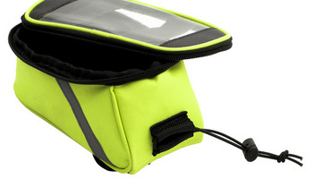 Torebka z przegródką na smartfon do zamontowania na ramę roweru. Zwiększa widoczność rowerzysty dzięki odblaskowym elementom. Umożliwia korzystanie z funkcji dotykowych telefonu przez folię. Telefon nie jest dołączony.