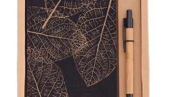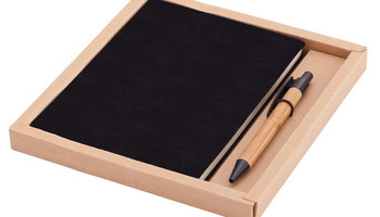 Zestaw składający się z notesu w lnianej, drukowanej okładce (90 kartek w kratkę, 80 g/m2) oraz długopisu bambusowego z plastikową skuwką, przyciskiem i końcówką wyposażonego w wkład koloru niebieskiego. Pakowany w kartonowe pudełko. Rozmiar biurkowy.
