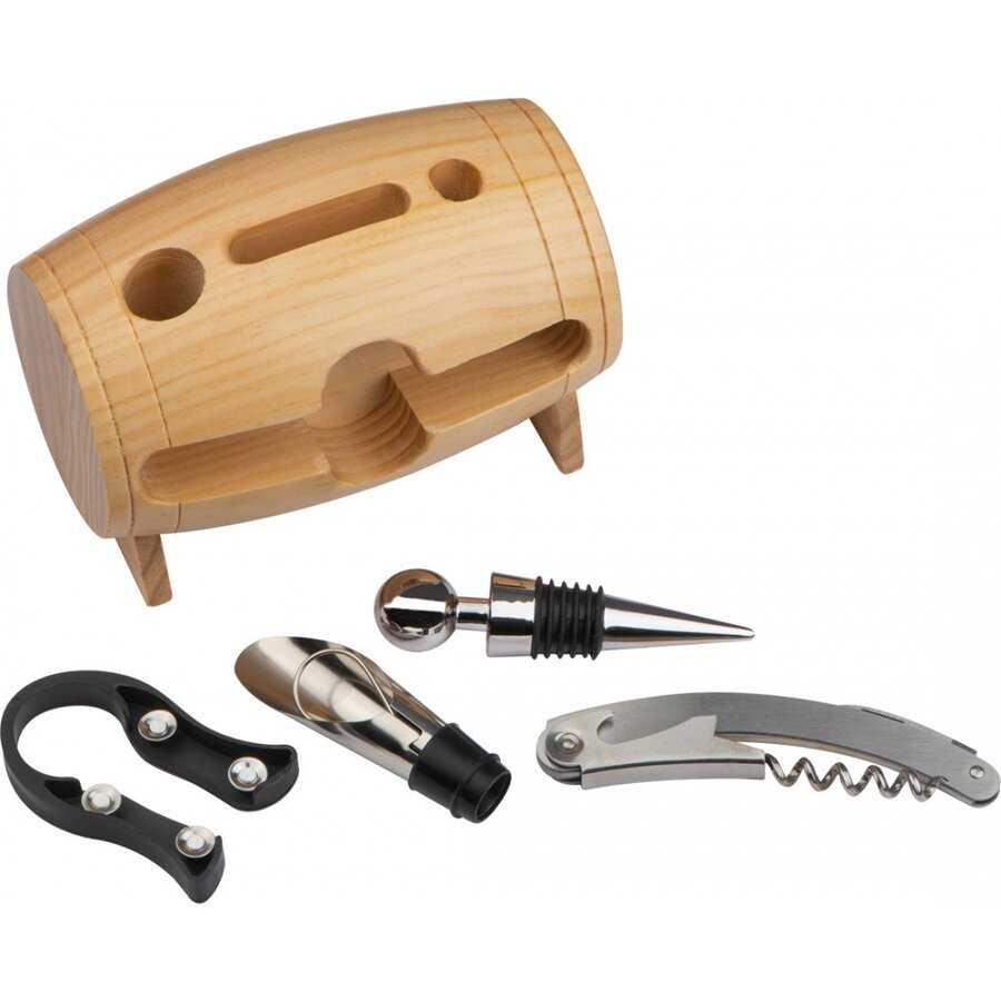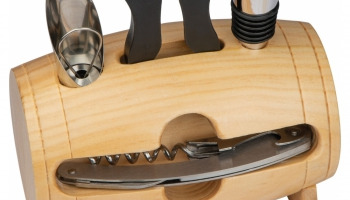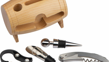 Zestaw do wina umieszczony w stojaku w kształcie beczki, zawiera nóż kelnerski, lejek z zatyczką, korek do butelki oraz nożyk do folii.