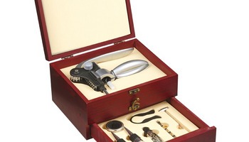 Pomysłowo zaprojektowany dwuszufladowy zestaw do wina. Składa się z aluminiowego otwieracza, obcinaka do folii, nalewaka z zatyczką, dwóch zatyczek, okapnika, zapasowej końcówki do otwieracza i termometru.