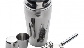 Zestaw koktajlowy z chromowanego metalu składający się z shakera o poj. 500 ml, miarki oraz regulowanego sitka.