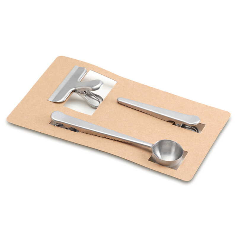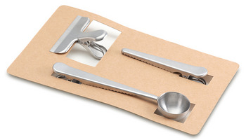 Zestaw ze stali nierdzewnej składający się z łyżeczki do odmierzania porcji oraz klipsów, które służą zabezpieczeniu opakowania po otwarciu. Długość łyżeczki z klipsem 17cm, pojemność łyżeczki ok. 7g; długi klips 12cm, krótki klips 8cm. Praktyczne akcesoria przydatne w każdej kuchni.