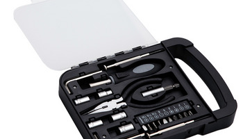 Wieloelementowy zestaw narzędzi w pudełku z uchwytem. Zawiera: wkrętak precyzyjny PH (krzyżowy), wkrętak precyzyjny, płaski, adapter (¼”), klucz Torx – 3 rozmiary, wkrętak płaski – 2 rozmiary, wkrętak PZ (krzyżowy) – 2 rozmiary, wkrętak PH (krzyżowy) – 2 rozmiary, klucz imbusowy – 2 rozmiary, klucz nasadowy/oczkowy – 5 rozmiarów (6-10), szczypce uniwersalne, uchwyt wkrętakowy uniwersalny, magnetyczny (¼”), przedłużkę 35 mm (¼”).