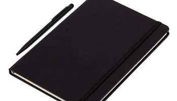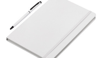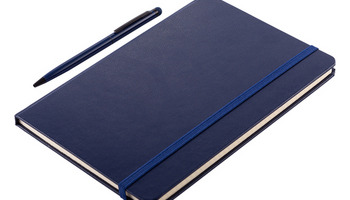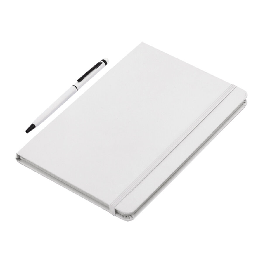 Zestaw składający się z notesu i długopisu. Notes w twardej oprawie, 72 kartkowy w kratkę (papier 70 g/m2) z tasiemką do zaznaczania zapisanej ostatniej strony i elastyczną gumką chroniącą wnętrze. Długopis aluminiowy z rysikiem do obsługi ekranów dotykowych, wyposażony w niebieski wkład. Zestaw pakowany w czarne upominkowe pudełko.