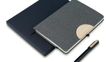 Zestaw składający się z notesu i długopisu, zdobionych bambusowymi elementami. Notes w twardej oprawie, którą można zmienić w podstawkę pod telefon. 80 kartek w linie (papier 70 g/m2), tasiemka do zaznaczania zapisanej ostatnio strony i elastyczna gumka chroniącą wnętrze. Długopis aluminiowy o matowym wykończeniu, wyposażony w niebieski wkład. Zestaw pakowany w czarne, upominkowe pudełko.