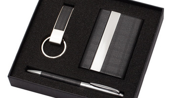 Wykonany z metalu i ekoskóry zestaw upominkowy składający się breloka, wizytownika na 15 wizytówek i długopisu wyposażonego w niebieski wkład. Pakowany w opakowanie upominkowe.