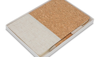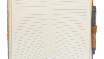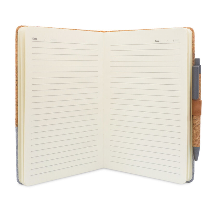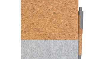 Elegancki notes łączący naturalny korek z płótnem. Rozmiar A5, 80 kartek w linie ( gramatura70 g/m2). Wyposażony w długopis wykonany z korka, słomy pszennej i PP. Pakowany w pudełko.
